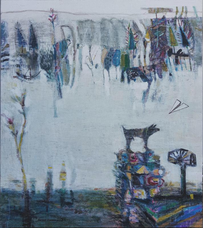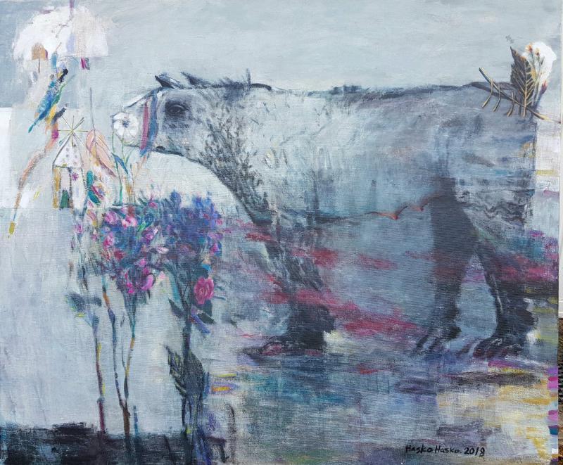 Når jeg betragter Haskos malerier, føler jeg mig suget ind en drømmeverden, der er befolket af dyr og mytiske figurer i en kunstfærdig enkelthed. Billederne er tæt på jorden, udforsker mulden, græsset, dyrene og havet. Den uberørte natur giver ved første blik et fredeligt billede af en intakt verden.